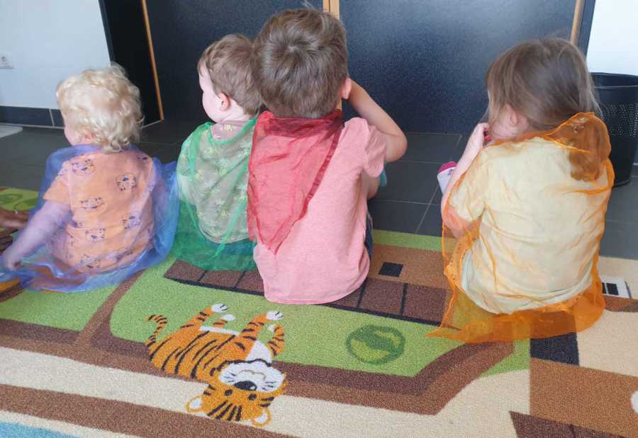 Anschließend erhielten die Kinder bunte Tücher, mit denen sie zu dem Lied "Schmetterling, Du kleines Ding" fröhlich durch den Raum tanzten. Dabei durften natürlich auch die Instrumente nicht fehlen!